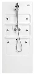 由真空成形,特殊等級的白塑料做成。 有架子式隔間,水按摩噴管,恒溫控制的冷熱水混合龍頭,沐浴頭和立管軌組成。 可用于替換壁板/坐椅板。