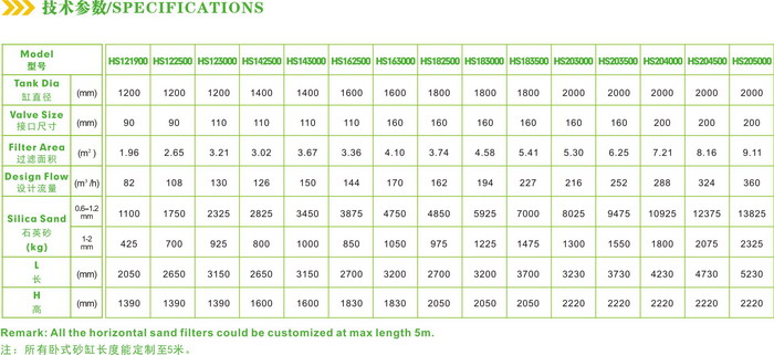最大工作壓力2.5kg/cm²(35psi)最高承受溫度50℃(122F)直徑1200mm的濾床高度:0.6m直徑1400mm的濾床高度:0.8m直徑1600mm的濾床高度: 1m直徑1800mm的濾床高度: 1m直徑2000mm的濾床高度: 1m