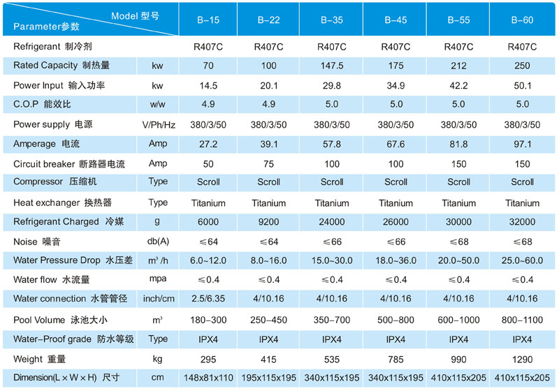 名稱:加熱器設備-Calorex 泳池水加熱 熱泵機組 B系列 型號:B系列 產品規格: -能效比(COP)在4.9和5.4之間 -配有電源線,插頭和10mA剩余電流斷路器 -彩色數字顯示屏,容易操作 -使用RH07C制冷劑,具有更高的效率和對環境友好 -自動熱氣體除霜 -易自診斷數字控制 -所有功能都是由微處理器控制 -旋轉式或渦旋式壓縮機具有低噪音,風扇運行安靜低噪音 -耐鹽和氯鈦換熱器 -15%的過大的蒸發器和熱交換器的效率更高 -數字控制 -冷卻和加熱池水功能 -外部溫度較低時仍保持高效率 -30%超大蒸發器和熱交換器使運行效率更高 -全季節模式,從+5°C開始工作 -多達四個壓縮機,都具有循環除霜功能 -多臺壓縮機的級聯操作
