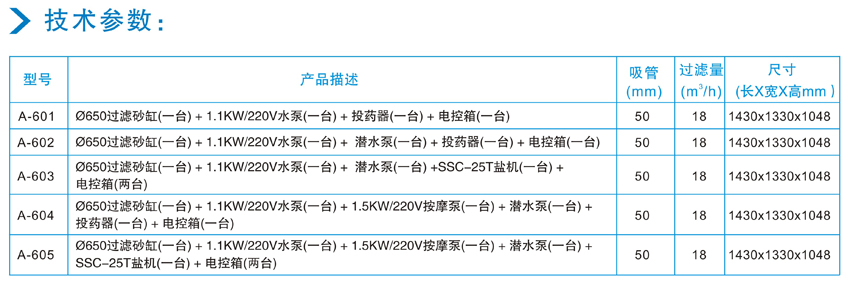 名稱:一體化泳池過濾設備-Aquaplay雅普一體化過濾設備 A-601系列 型號:A-601系列 Aquaplay“雅普”地埋式一體機源自美國設計與技術,有多年泳池一體機研發與生產經驗,在行業內擁有多項技術專利。Aquaplay“雅普”地埋式一體機是一個全能型機房,把整個泳池所需的全部設備整合到一體機中,行業稱:微型機房。把泳池所需的動力設備、過濾設備、消毒設備、控制系統、檢測設備等完美融合于一身,與傳統機房相比,擁有建造成本低,安裝工期快、堅固耐用使用方便、維修簡便、占地空間小等優勢。歐美家庭通常把地埋機埋在泳池邊的草地上,與環境融為一體,建造安裝與使用過程中不污染環境不影響庭園布置格局。整個設備在工廠完成,流水線生產,之星ISO9001安全標準,整體建造成本優勢明顯,性價比高。 雅普地埋式一體機優點: 全新設計: Aquaplay“雅普”地埋式一體機采育館開放式平臺,客戶可針對各自需求選配加裝不同的消毒方式,例如傳統投藥器、紫外線、鹽氯機、臭氧機及銅銀離子處理器。 也可選不同過濾方式:石英砂、聚酯纖維。 耐用性: Aquaplay“雅普”泳池地埋過濾一體機殼體堅固、耐腐蝕、可承受500公斤的壓力、耐溫-40°C-75°C、殼體采用聚酯材料注塑而成。把制造飛機、輪船、汽車殼體的超大型注塑機組和技術用于制造一體機。具有極佳的抵抗惡劣氣候和抵抗低溫的能力,非常適合室外地埋安裝。是私家別墅泳池,中小型游泳池,室外SPA水療按摩池的水質循環過濾首選。 便利性: Aquaplay“雅普”一體化泳池過濾設備可選擇安置在游泳池周圍方便位置(埋于草地面下或庭園角落)無需建造機房,安裝簡便,從而降低了施工成本。從建造、使用、維護過程相當便利,工期短,效率高。 安全性: Aquaplay“雅普”一體化泳池過濾設備,機蓋采用加厚耐壓設計,可承受500公斤的壓力,配有安全鎖扣可防止小孩和小動物吳進入。 環保性: 外殼采用環保聚酯材料,對環境沒有污染,無需土建機房,完全融入周邊庭園環境。 實用性: 箱體底部設有地漏和水泵平臺,由于排水即時和設計了高出底部的水泵平臺,可防止水泵被淹;托盤設計在箱底底部,方便運輸。 A-601系列特性: 箱體內部表面光滑,高出底部的水泵平臺和地漏的特點設計,排水及時,有效防止水泵被淹。 選配:消毒設備可根據客戶要求加裝投藥泵、鹽氯機、紫外線消毒器或者銅銀離子消毒器等